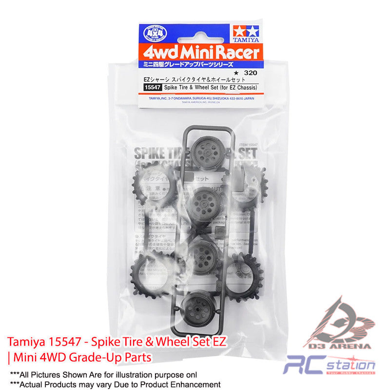 This wheel and tire set is for use with the EZ chassis. Spikes on the tires will boost your car's prowess on rough terrain, and wheels are a stylish dish design molded in dark gray plastic that will give your car a cool look. The set includes 4 each of wheels and tires, enough to fully kit out one car.