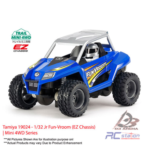 This is a Mini 4WD car model kit inspired by full-size 4WD UTV buggies, with robust suspension and a driver figure for installation in the cockpit. Metallic stickers are included in the kit to add logos and other details to the body, while the EZ chassis has a double-shaft motor and requires no cement or screws during assembly. Off-road tires help it to take on steep slopes. The easy-to-assemble Fun-Vroom is a brand new type of Mini 4WD that is sure to entertain!