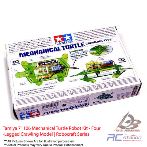 Tamiya presents the 4-leg crawling-type Mechanical Turtle as its next Robocraft Series item. Motor rotating power is transferred to the legs via crank plates to make the Turtle crawl. Each pair of legs (front and rear) are molded as one piece and front leg plate is attached with a ball joint that serves as a fulcrum to realistically imitate turtle crawling. Legs and body on which the gearbox is mounted employ transparent-colored parts, giving the turtle a funky look. Reverse switch is also transparent, giving you a peek at the turtle's internal mechanisms. Assembly is very simple with use of screws and snap-lock parts.