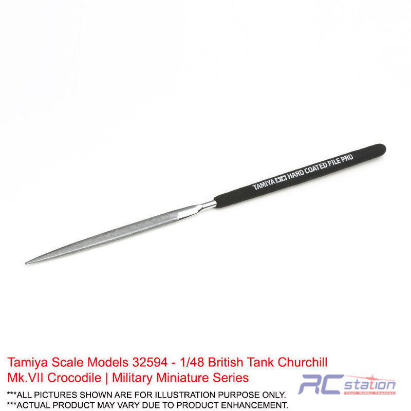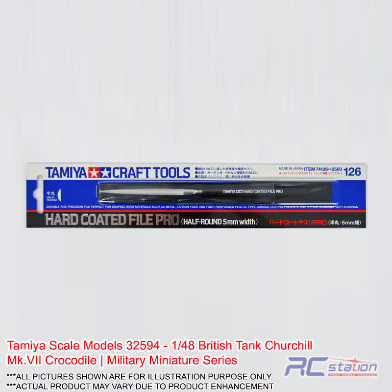 This durable and precision-made file is perfect for shaping both hard materials such as metal, carbon fiber, and FRP, and softer materials such as normal plastic parts. It features a chrome coating which helps prevent the teeth from clogging with shavings. It has superb durability, lasting up to 3-6 times longer than standard steel files. This versatile half-round file joins flat (Item 74106) and round (Item 74107) products in the Tamiya line-up.