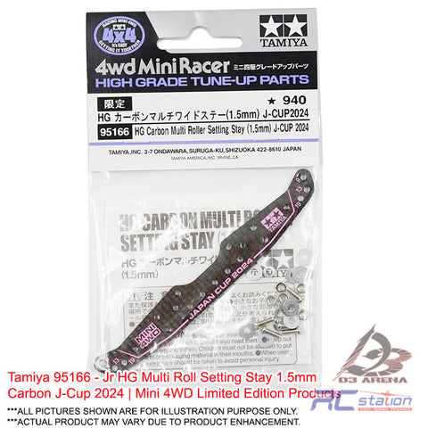 This limited edition 1.5mm thickness carbon fiber stay features pink lettering and logos commemorating the Japan Cup 2024. It lets you attach 9mm, 13mm and 19mm rollers in wide positions, allowing you to really fine-tune your Mini 4WD car just how you want it.