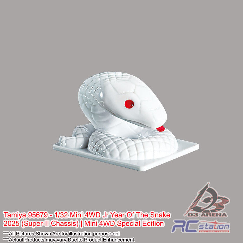 This Mini 4WD kit features the Chinese zodiac snake for 2025. The kit includes a pre-assembled, pre-painted white color snake racer figure. The red and white color scheme is closely associated with New Year in Japan.