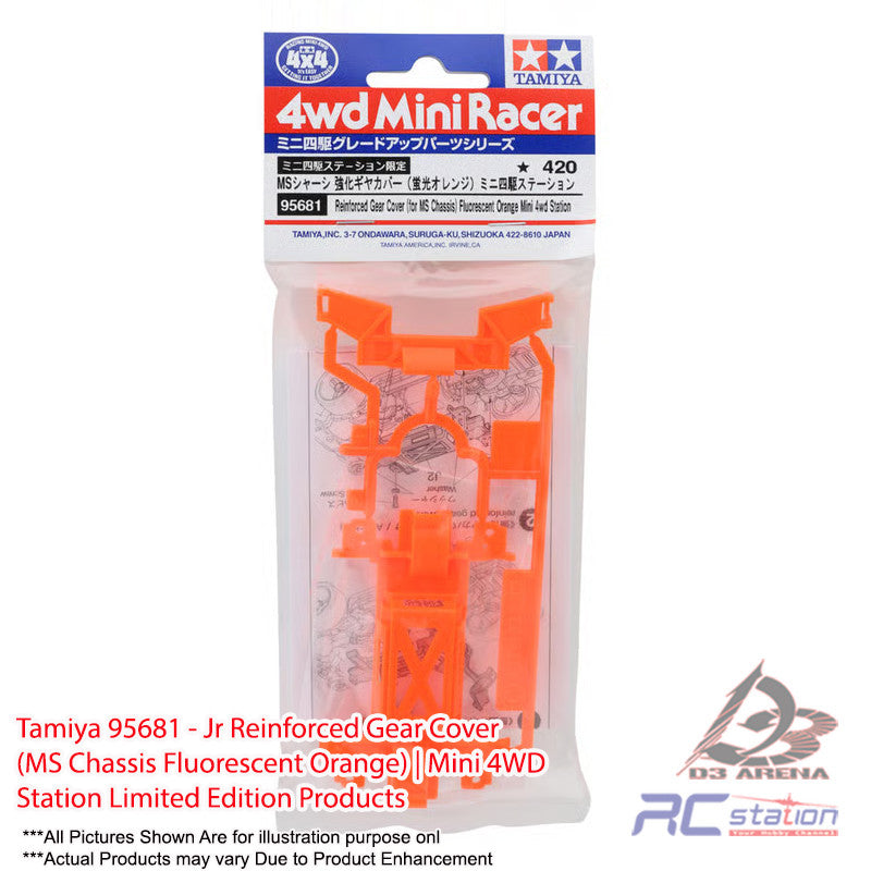 This set is used in place of kit standard A2 (gear cover) and A6 (battery cover) parts. The gear cover is solidly attached with 4 screws, boosting your car’s rigidity. Parts are molded in eye-catching fluorescent orange. Can be used with ITEM 95682 MS Chassis Set (Fluorescent Orange) Mini 4WD Station.