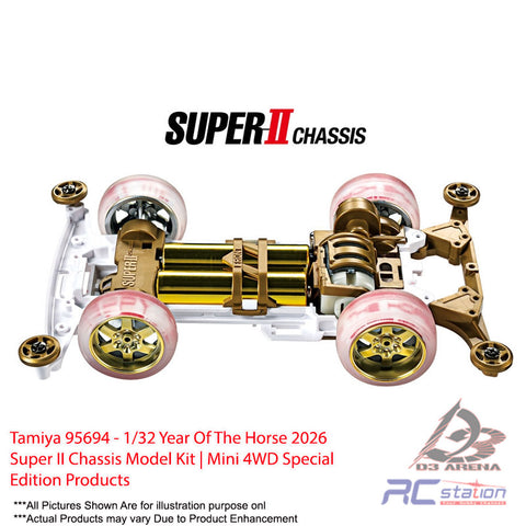 The Super-II chassis offers impressive toughness on an adaptable frame. Here, it appears in white ABS plastic and is matched with gold color battery holder, rear stay and roller parts. The model also features turn switches and double attachment points for the rear stay. Multiple bumper and rear stay attachment holes allow a range of set-up options. Matte gold plated 6-spoke wheels have stickers with HAPPY NEW YEAR and YEAR OF THE HORSE 2026 messages that are visible through the clear large-diameter tires, and the model comes with 5:1 gears and a motor.