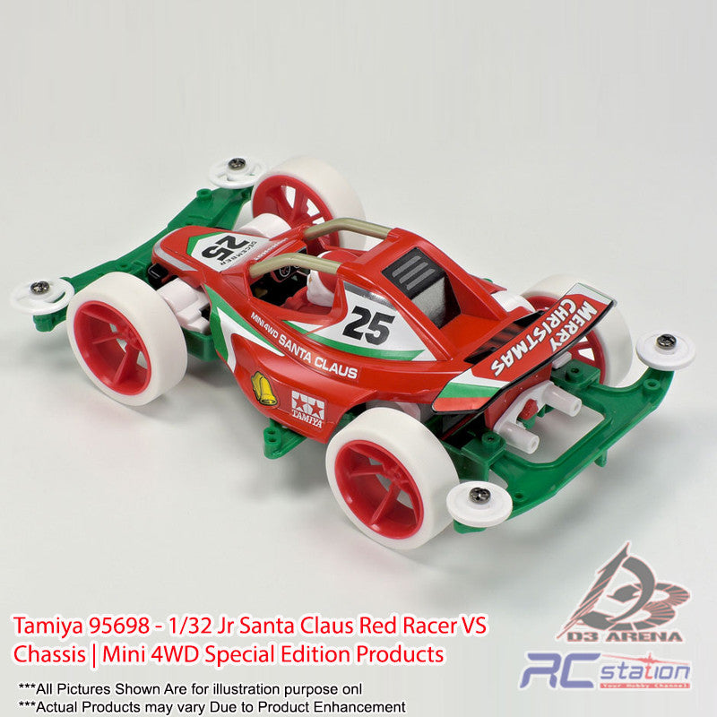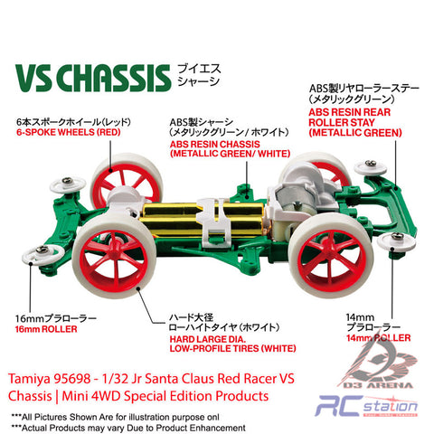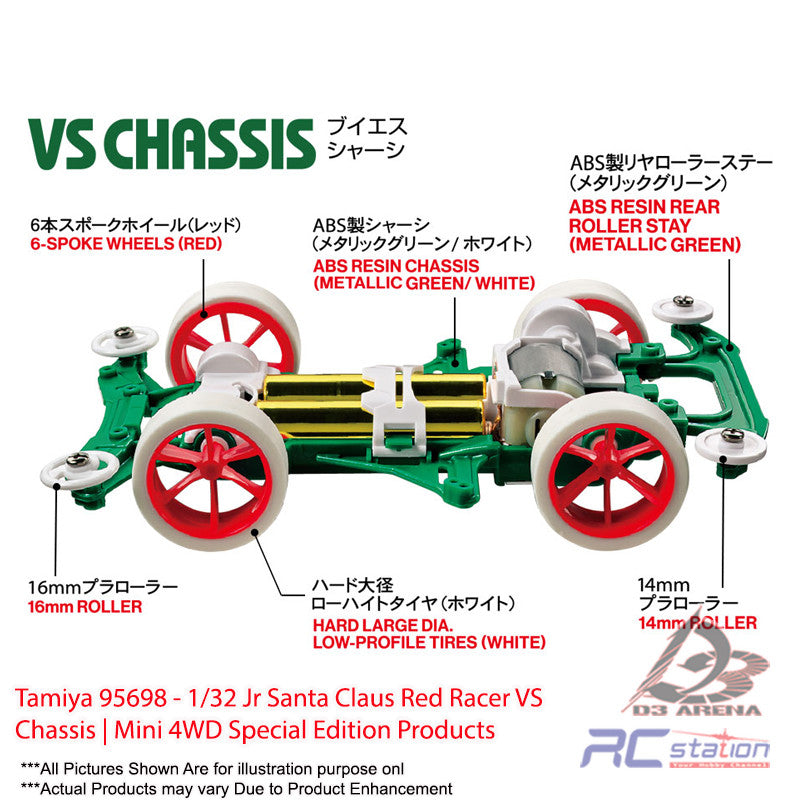 The VS chassis is a lightweight chassis featuring a short wheelbase, air ducts to help cool the motor, and a hinged switch cover/battery holder. The main chassis and A parts are ABS plastic; chassis and rear roller stay are metallic green, with rollers and battery holder in white for a Christmassy image. Red 6-spoke wheels are paired with hard, large-diameter low-profile tires in white. The model comes with 5:1 gears.