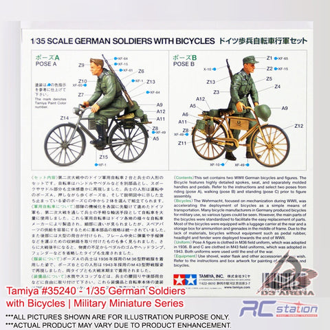 This is a plastic assembly model kit which includes two German soldiers on bicycles. Separate parts to depict the bicycles' handles and pedals as well as detailed wheel spokes and seats provide the models with added realism. You can choose to assemble the soldier figures in either a standing or cycling pose. Display your models on their own or even as a part of a larger diorama.