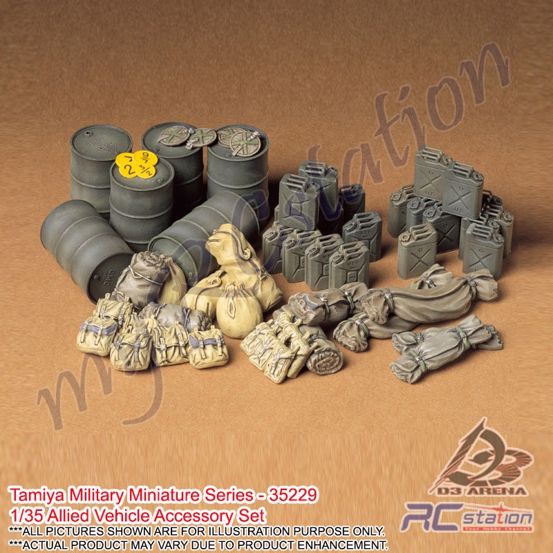 You will be able to provide your 1/35 scale model with an even greater air of realism once it is fully loaded with accessories from this set. A rich assortment of allied army use equipment such as drum cans, jerry cans, buckets, a variety of canvas goods including bags, and vehicle weight plates are realistically reproduced.