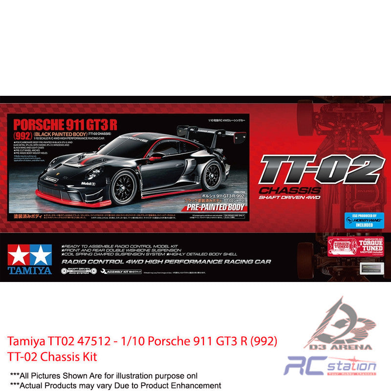 This radio-controlled model assembly kit recreates the Porsche 911 GT3 R (992) with a stunning and highly detailed polycarbonate body that comes pre-painted in black for this limited-edition release. The kit is based on the beginner friendly and highly customizable TT-02 chassis, which allows hobbyists to grow as their driving and building skills develop.